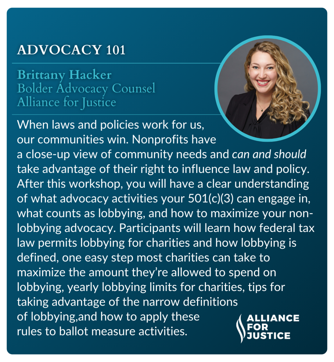 Brittany Hacker, Bolder Advocacy Counsel, Alliance for Justice |