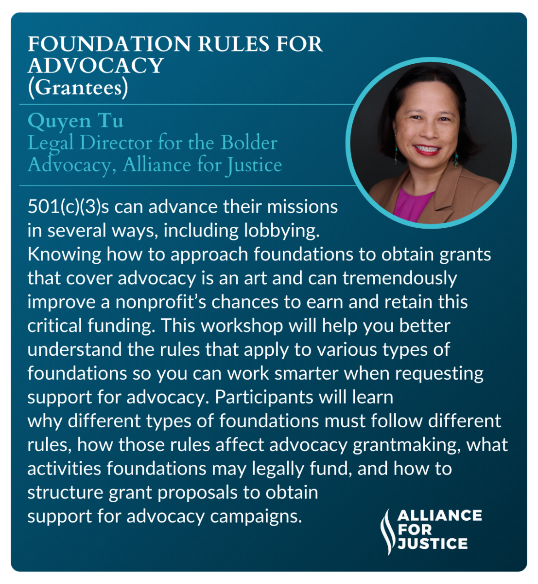 Quyen Tu, Legal Director for the Bolder Advocacy, Alliance for Justice |