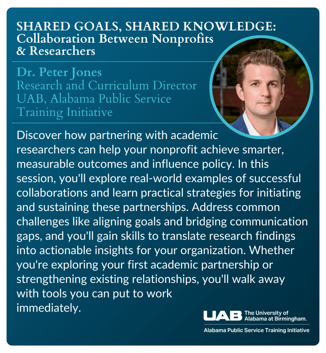Dr. Peter Jones, Research and Curriculum Director, UAB, Alabama Public Service Training Initiative |