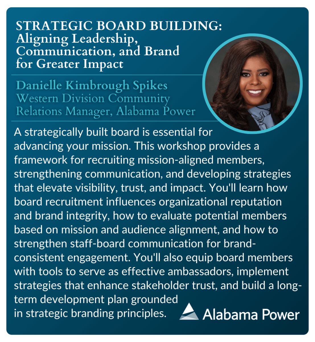 | Strategic Board Building: Aligning Leadership, Communication, and Brand for Greater Impact | Danielle Kimbrough Spikes, Western Division Community Relations Manager, Alabama Power |