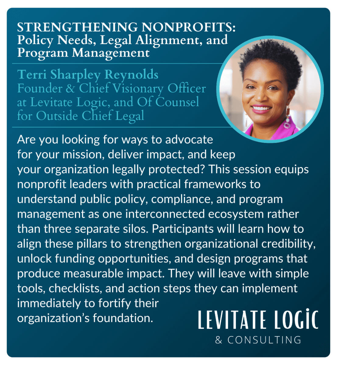 | Strengthening Nonprofits: Policy Needs, Legal Alignment, and Program Management | Terri Sharpley Reynolds, Founder and Chief Visionary Officer at Levitate Logic, and Of Counsel at Outside Chief Legal |