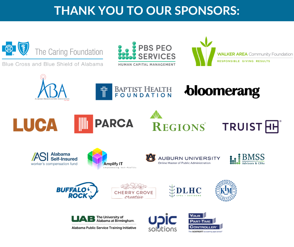 - A limited number of registration and travel scholarships are available for nonprofits serving Walker, Winston, Fayette, and Marion counties (please contact danielle@alabamanonprofits.org)
