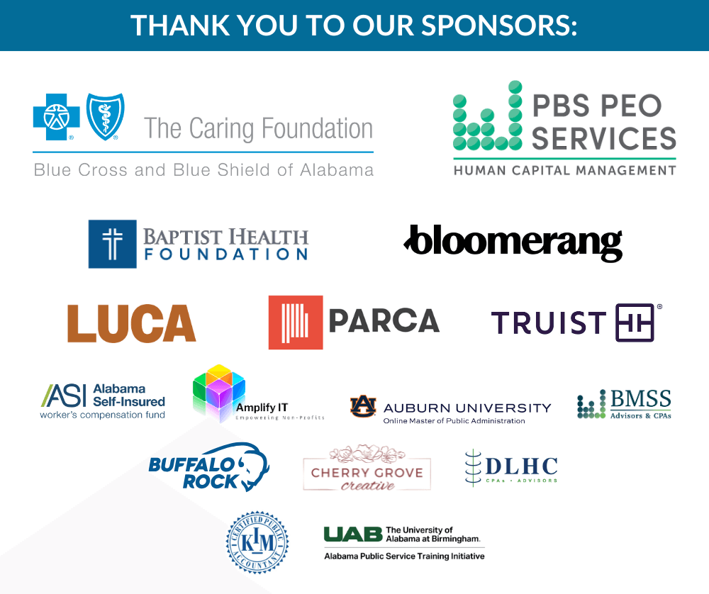 To make a sponsorship commitment, learn more, or discuss a custom sponsorship, please contact Danielle Dunbar, Executive Director at danielle@alabamanonprofits.org. Nonprofit organizations receive special pricing on select sponsor levels.